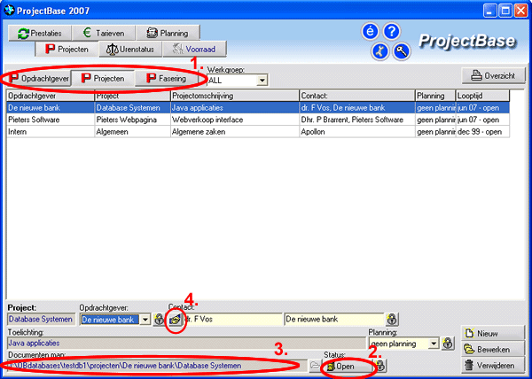 Met ProjectBase is beheer van projecten mogelijk en kan snel inzicht verkregen worden van de status van projecten evenals in verschillende doorsnede van de bedrijfsprestaties. Inzicht in en beheer van projecten Met ProjectBase stelt men de projecten in, en kunt u bepalen op welke wijze op het project geboekt kan worden. U kunt daarbij invulling geven aan een geheel eigen tariefstructuur en verkrijgt daarbij inzage in de progressie en de effici�ntie waarbij u ook kunt beoordelen in welke mate een bepaald type activiteiten succesvol/profijtelijk is. Op deze manier zijn geavanceerde bedrijfsoverzichten per druk op de knop beschikbaar. Omdat het programma verregaand inzage in uw bedrijf kan geven, heeft het een belangrijke waarde als management instrument. Overtuig uzelf van de mogelijkheden en download nu het pakket gratis voor 50 dagen op proef. | |